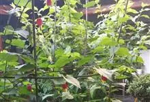 红萼苘麻是锦葵科、苘麻属常绿软木质灌木,叶绿色,长5-10厘米,心形,叶端尖,叶缘有钝锯齿,有时分裂,有细细的叶柄;叶互生,掌状叶脉;花单生于叶腋,具长梗,下垂;花萼红色,半套着大约4厘米长的花瓣,…全部>>