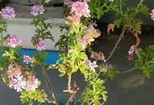 蔓性天竺葵学名盾叶天竺葵 Ait.)是牻牛儿苗科天竺葵属植物。多年生攀缘或缠绕草本,长40-100厘米,茎具棱角,多分枝,叶互生,略呈肉质,伞房花序腋生,有花数朵,花冠洋红色,上面2瓣着深色条纹,…全部>>