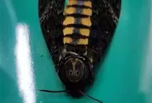鬼脸天蛾,是鳞翅目天蛾科面形天蛾属动物。成虫翅展100~125毫米,体黑褐色;胸背有骷髅形斑纹;卵圆球形,直径约2毫米,淡黄绿色,表面光滑;老熟幼虫体长70~90毫米,蛹体长约56毫米;前翅为褐色,…全部>>