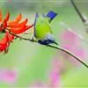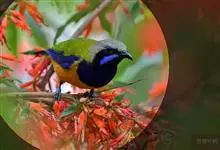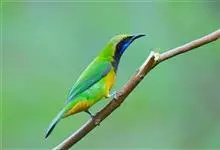 蓝翅叶鹎:小型鸟类,体长15-18厘米。雄鸟通体草绿色,尾蓝绿色,肩和翅亮蓝 色,胸缀有黄色,颏、喉黑色。雌鸟颏,喉蓝绿色。栖息在海拔1500米以下的常绿阔叶林、次生林和林缘疏林灌丛中。…全部>>
