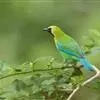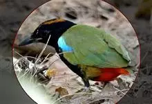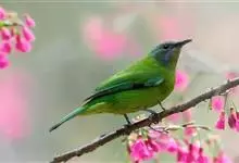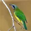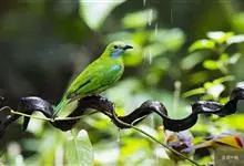 蓝翅叶鹎:小型鸟类,体长15-18厘米。雄鸟通体草绿色,尾蓝绿色,肩和翅亮蓝 色,胸缀有黄色,颏、喉黑色。雌鸟颏,喉蓝绿色。栖息在海拔1500米以下的常绿阔叶林、次生林和林缘疏林灌丛中。…全部>>