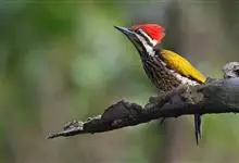 三趾啄木鸟,是啄木鸟科、啄木鸟属的小型鸟类,体长20-23厘米,雄鸟头顶金黄色,雌鸟黑色而具白色斑点。眼至耳覆羽黑色,眼后有一条白色纵纹,颊纹白色,颚纹黑色,甚为醒目。枕和后颈黑色,…全部>>