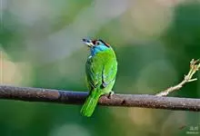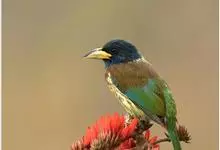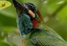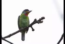 黑眉拟啄木鸟,为须䴕科、拟啄木鸟属的小型鸟类,体长20-25厘米,外形和金喉拟啄木鸟非常相似,但具粗著的黑色眉纹,头侧和耳覆羽以及下喉蓝色而不为银灰色,前颈两侧各有一块鲜红色斑。全部>>
