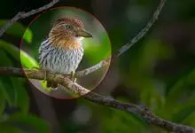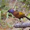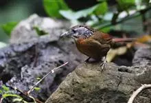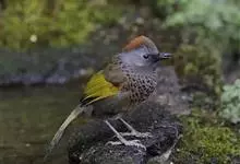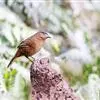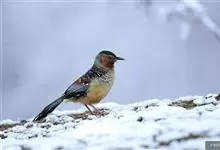 大噪鹛:中型鸟类,体长32-36厘米。额至头顶黑褐色,背栗褐色满杂以白色斑点,斑点前缘或四周还围有黑色。初级覆羽、大覆羽和初级飞羽具白色端斑。尾特长,均具黑色亚端斑和白色端斑。颏、喉棕褐色,…全部>>