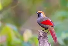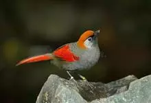 赤尾噪鹛中型鸟类,体长24~28厘米。头顶至后颈红棕色,两翅和尾鲜红色,眼先、眉纹、颊、颏和喉黑色,眼后有一灰色块斑。其余上下体羽大都暗灰或橄榄灰色。特征极明显,特别是通过鲜红色的头顶、翅和尾。…全部>>