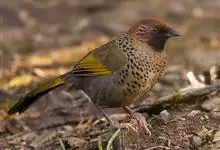 红头噪鹛中型鸟类,体长22~28厘米。头顶棕红色,眼先、脸、颏、喉黑色,上体橄榄色或棕橄榄褐色,外侧飞羽金黄色,尾羽基部亦为金黄色,下体多为暗橄榄褐色。该种和赤尾噪鹛较为相似,…全部>>