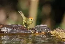 金头穗鹛小型鸟类,体长10~11厘米,是一种黄色小鸟。头顶金黄色有黑色纵纹,眼先黑色,在头、颊和耳羽金黄色的衬托下亦甚醒目。上体橄榄黄色,下体亮黄色,腹和两胁沾绿。…全部>>