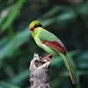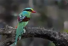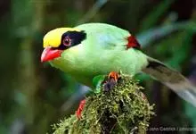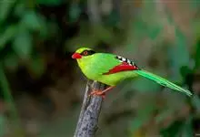蓝绿鹊:中型鸟类,共有5个亚种。体长36-38厘米。尾长,嘴、脚红色。通体羽色主要为草绿色,宽阔的黑色贯眼纹向后延伸到后颈,在绿色的头侧极为醒目。两翅栗红色,内侧飞羽具黑色次端斑和白色尖端。尾绿色,…全部>>