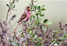 藏朱雀:全长约17-18厘米。雄鸟头部深红色具光辉,喉部暗红色具白色点斑;背部灰白色,各羽具玫瑰红色羽端,形成许多斑纹;腰部淡玫瑰红色;翅暗褐色,沾灰白,羽端沾玫瑰红或灰白色;尾暗棕色,端缘玫瑰红色…全部>>