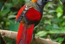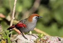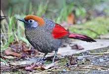 赤尾噪鹛中型鸟类,体长24~28厘米。头顶至后颈红棕色,两翅和尾鲜红色,眼先、眉纹、颊、颏和喉黑色,眼后有一灰色块斑。其余上下体羽大都暗灰或橄榄灰色。特征极明显,特别是通过鲜红色的头顶、翅和尾。…全部>>