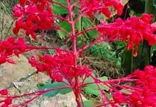 红萼龙吐珠马鞭草科大青属常绿木质藤本。叶对生,纸质,具柄,卵状椭圆形,全缘,先端渐尖,基部近圆形。聚伞花序腋生或顶生,花冠红色,花萼红色,雌雄蕊细长,突出花冠外。核果。花期春至秋末。 全部>>