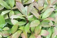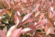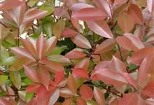红叶石楠 是蔷薇科,石楠属杂交种,为常绿小乔木或灌木,乔木高可达5米、灌木高可达2米。叶片革质,长圆形至倒卵状、披针形,叶端渐尖,叶基楔形,叶缘有带腺的锯齿,花多而密,复伞房花序,花白色,梨果黄红色,…全部>>
