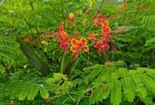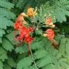 洋金凤 Sw.),豆科小凤花属灌木状或小乔木植物,枝无毛,绿或粉绿色;二回羽状复叶;总状花序伞房状,萼片无毛,花瓣橙红或黄色,圆形,花丝红色,子房无毛,花柱橙黄色;荚果窄而薄,…全部>>