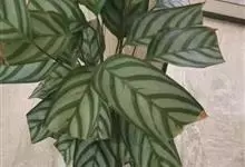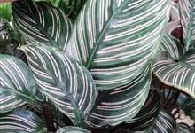 孔雀竹芋:竹芋科,肖竹芋属多年生常绿草本植物。植株挺拔株高可达60厘米。叶柄紫红色, 叶片薄革质,卵状椭圆形,叶面上有墨绿与白色或淡黄相间的羽状斑纹,就像孔雀尾羽毛上的图案,因而得名。…全部>>