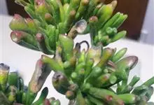 筒叶花月,是景天科青锁龙属的多年生草本植物。植株多分株,灌木状,茎较粗壮,圆柱形,表皮灰褐色;叶片肉质,互生,呈圆筒状,簇生于茎或分枝顶端,叶端呈斜截形,截面为椭圆形;花呈星状,淡白色;花期秋季。…全部>>