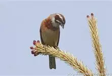 栗斑腹鹀:属小型鸣禽。体重19-25克,体长145-167毫米。头顶至背栗红色,眼先和颧纹黑褐色,黑色颧纹上还有一白纹,耳羽褐色或灰褐色,眉纹白色或灰白色。背、肩具黑色纵纹,腰至尾上覆羽砖红色无纵纹,…全部>>