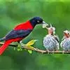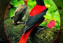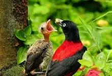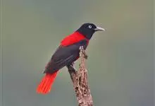 朱鹂:中等鸟类,体长23-28厘米。雄鸟绛紫红色,头、上胸及翼黑色。雌鸟上背及背部深灰色,尾覆羽及尾绛紫红色,腹部及下胸白而密布黑色纵纹。与鹊色鹂幼鸟的区别在上背灰色较深,下体白色较少且纵纹较粗。…全部>>