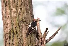 大斑啄木鸟隶属鸟纲鴷形目啄木鸟科。雄鸟头顶黑色,枕部红色,眼先、颊部和耳羽白色,颈部污白色,下嘴基部至后颈有1道黑色条纹并与从颈侧延伸到胸侧的黑色条带相连,背和两翼黑色,肩部具1个大的白色斑块,…全部>>
