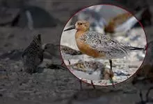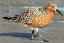 红腹滨鹬,是鹬科、滨鹬属的小型涉禽,体长23-25厘米,嘴较短而直、黑色,脚亦甚短、绿色。体较粗胖。夏季上体灰褐色具黑色中央纹,背具棕栗色和白色斑纹和羽缘,头侧和整个下体栗红色。冬季棕红色消失,…全部>>