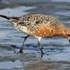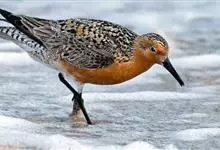红腹滨鹬,是鹬科、滨鹬属的小型涉禽,体长23-25厘米,嘴较短而直、黑色,脚亦甚短、绿色。体较粗胖。夏季上体灰褐色具黑色中央纹,背具棕栗色和白色斑纹和羽缘,头侧和整个下体栗红色。冬季棕红色消失,…全部>>