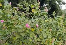木芙蓉,锦葵科木槿属落叶灌木或小乔木。小枝上有细绒毛;叶片为卵状心形,托叶为披针形,常早落;花单生,花萼为钟形,花冠初为白色或淡红色,后逐渐变为深红色;果实为扁球形,有淡黄色的毛附着。花期8到10月。…全部>>