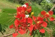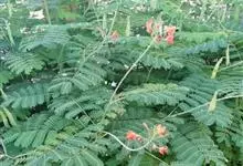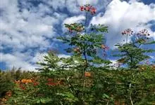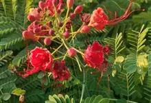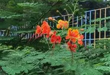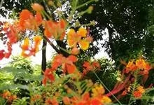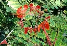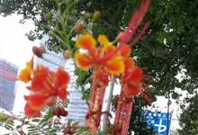 洋金凤 Sw.),豆科小凤花属灌木状或小乔木植物,枝无毛,绿或粉绿色;二回羽状复叶;总状花序伞房状,萼片无毛,花瓣橙红或黄色,圆形,花丝红色,子房无毛,花柱橙黄色;荚果窄而薄,…全部>>