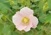 海滨木槿是锦葵科木槿属植物,落叶小乔木,株高3-5米,胸径20厘米,扁球形树冠,枝叶繁盛。厚纸质单叶互生,扁圆形、倒卵形或宽倒卵形,先端钝近平,具短突尖,基部圆形或浅心形,叶缘中上部具细圆齿,…全部>>