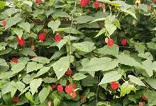 红萼苘麻是锦葵科、苘麻属常绿软木质灌木,叶绿色,长5-10厘米,心形,叶端尖,叶缘有钝锯齿,有时分裂,有细细的叶柄;叶互生,掌状叶脉;花单生于叶腋,具长梗,下垂;花萼红色,半套着大约4厘米长的花瓣,…全部>>
