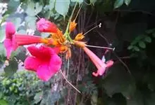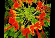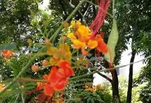 洋金凤 Sw.),豆科小凤花属灌木状或小乔木植物,枝无毛,绿或粉绿色;二回羽状复叶;总状花序伞房状,萼片无毛,花瓣橙红或黄色,圆形,花丝红色,子房无毛,花柱橙黄色;荚果窄而薄,…全部>>