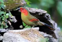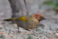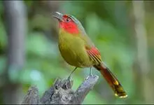 红翅薮鹛是噪眉科、薮鹛属中型鸟类,体长21-24厘米。头顶灰褐色,头侧和颈侧赤红色,上体橄榄褐色,翅上具红色块斑,尾具红色或橙黄色块斑,下体灰色沾褐。虹膜褐色或红色,嘴黑色,脚暗褐色或淡灰褐色。…全部>>
