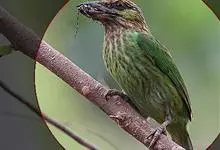 绿拟啄木鸟为鴷形目,须科,拟啄木属的一种。形较大拟啄木鸟略小,体长约260mm。头、颈及胸浅褐而具淡黄白色条纹;喉几为淡黄白色;身体余部草绿色。虹膜棕褐色,眼周裸露部黄色;嘴峰角黄色;跗跖和趾角黄…全部>>