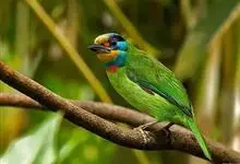 金喉拟啄木鸟,是须鴷科、拟啄木鸟属的鸟类。金喉拟啄木鸟为小型鸟类,体长19-24厘米。额深红色,头顶金黄色,后枕具一大块深红色斑,耳羽和头侧银灰色,上体草绿色,颏和上喉金黄色,下喉淡银灰色,…全部>>