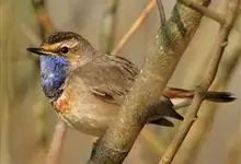 蓝点颏亦称“蓝喉歌鸲”,通称蓝靛颏儿。身体大小和麻雀相似,体长12-13厘米,体重17-18克。头部、上体主要为土褐色。眉纹白色。尾羽黑褐色,基部栗红色。颏部、喉部辉蓝色,下面有黑色横纹。下体白色。…全部>>