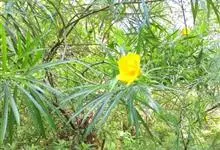 黄花夹竹桃K. Schum.),又名“酒杯花”“柳木子”“黄花状元竹”,是夹竹桃科,黄花夹竹桃属下的常绿乔木植物。高达5m,全株无毛,树皮棕褐色;叶互生,近革质,线形或线状披针形;花大,黄色,具香味,…全部>>