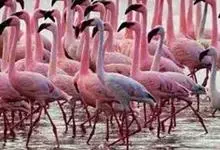 火烈鸟,是鹳形目红鹳科鸟类,属下共有六种。火烈鸟是大型水禽,体长1-2米;颈与足俱长,嘴短而厚,微向下弯曲;通体大部分羽色从粉红至深红,飞羽呈黑色;喙与足通常为鲜明的红色或黄色,眼橙色。…全部>>