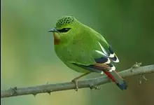 火尾绿鹛是莺科、绿鹛属小型鸟类,体长11-14厘米。上体绿色,头顶至枕具黑色鳞状斑,眼先和眼后黑色,眉纹黄绿色。两翅黑色具黄色和红色翅斑及白色端斑,极为醒目。中央一对尾羽绿色,外侧尾羽鲜红色。…全部>>