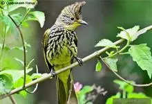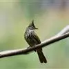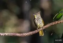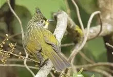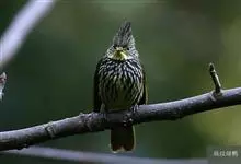 纵纹绿鹎,是鹎科鹎属的一种动物,是体型中等大小鸟类,体长20-24厘米。头绿褐色具明显的冠羽,其上具细的白色纵纹。上体橄榄绿色具细的白色纵纹。眼圈浅黄色。喉和尾和覆羽黄色,其余下体暗灰黑色具黄白色纵纹。…全部>>