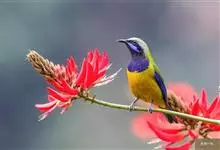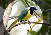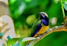 蓝翅叶鹎:小型鸟类,体长15-18厘米。雄鸟通体草绿色,尾蓝绿色,肩和翅亮蓝 色,胸缀有黄色,颏、喉黑色。雌鸟颏,喉蓝绿色。栖息在海拔1500米以下的常绿阔叶林、次生林和林缘疏林灌丛中。…全部>>