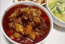 新疆大盘鸡又名为沙湾大盘鸡,是新疆名菜,起源于20世纪80年代,主要用料为鸡块和土豆块、四川粉皮,配皮带面烹饪而成。 色彩鲜艳、爽滑麻辣的鸡肉和软糯甜润的土豆,辣中有香、粗中带细,是餐桌上的佳品。全部>>