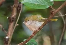 白腹凤鹛是绿鹃科、绿凤鹛属的小型鸟类,体长10-12厘米。上体从头到尾黄绿色,有短的羽冠,头顶微具黑色羽轴纹;眼先、眼周,耳羽和下体灰白色,尾下覆羽黄色。虹膜褐色或红褐色,上嘴浅褐色或肉褐色,…全部>>