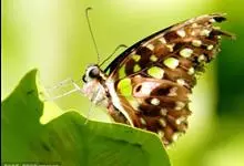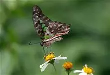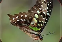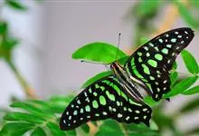 青带凤蝶Graphium sarpedon ,又名青凤蝶,是最普遍的中型凤蝶,飞行速度很快。青带凤蝶的翅膀中央有许多浅蓝色的斑点,很整齐地排列成一条直线。这些斑点由上而下逐渐变大,就像一条青色的带子。全部>>
