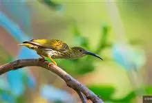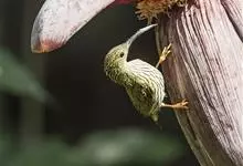 纹背捕蛛鸟:为太阳鸟科捕蛛鸟属的鸟类。是太阳鸟科中体型较大的一种,体重25-45克,体长160-210毫米。嘴粗长而尖且向下弯曲。上体橄榄黄色具黑色中央斑纹。下体淡黄白色满布黑色纵纹,尾具黑色次端斑。…全部>>