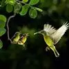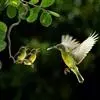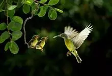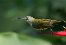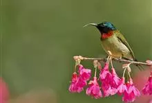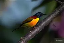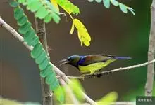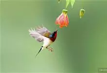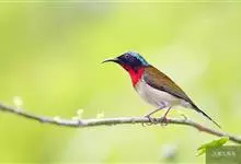 绿喉太阳鸟:共有9个亚种。小型鸟类,雄鸟体长13-15厘米、雌鸟10-12厘米。雄鸟前额至后颈、颏和喉辉绿色,头侧黑色,颈侧和背暗红色,两肩、下背橄榄绿色,腰鲜黄色,尾上覆羽和中央尾羽暗绿色,…全部>>