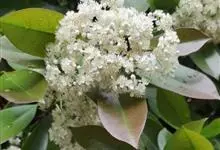石楠 Kalkman),是蔷薇科石楠属的常绿乔木,高5~12米,株型紧凑,树冠圆球形。树枝为褐灰色;鳞片为褐色,没有毛;叶片革质,长椭圆至侧卵状椭圆形,有锯齿,新叶红色光亮。复伞房花序,白色小花,…全部>>