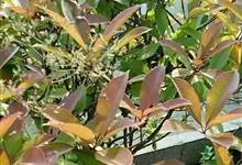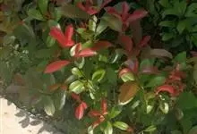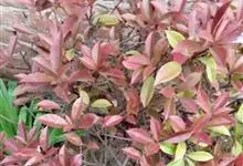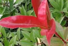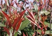 红叶石楠 是蔷薇科,石楠属杂交种,为常绿小乔木或灌木,乔木高可达5米、灌木高可达2米。叶片革质,长圆形至倒卵状、披针形,叶端渐尖,叶基楔形,叶缘有带腺的锯齿,花多而密,复伞房花序,花白色,梨果黄红色,…全部>>