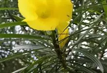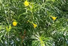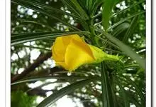 黄花夹竹桃K. Schum.),又名“酒杯花”“柳木子”“黄花状元竹”,是夹竹桃科,黄花夹竹桃属下的常绿乔木植物。高达5m,全株无毛,树皮棕褐色;叶互生,近革质,线形或线状披针形;花大,黄色,具香味,…全部>>