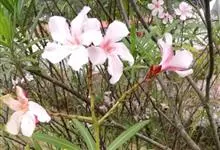 白花夹竹桃是夹竹桃科、夹竹桃属植物夹竹桃的栽培品种。常绿直立大灌木,枝条灰绿色;嫩枝条具稜,被微毛,老时毛脱落。叶3-4枚轮生,下枝为对生,叶面深绿,叶背浅绿色;侧脉纤细平行与中脉成直角;叶柄扁平,…全部>>