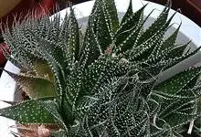 条纹十二卷 Haw.)是芦荟科十二卷属植物,为多年生肉质草本植物。植株高度10-15厘米,其呈莲座状生长;叶片紧密轮生在茎轴上,柔软多汁,呈长三角状披针形,极肥厚;叶面光滑、扁平,色深绿;叶背突起,…全部>>