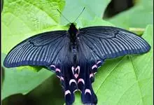 大二尾蛱蝶两翅正面黑色,中域有一浅绿色大型宽带纹,两翅反面浅绿色,中域有一缀黑边的褐色弧纹,亚外缘还有一深褐色横纹,后翅各有尾突两条,…全部>>