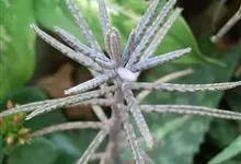 棒叶落地生根是景天科、落地生根属植物。茎直立、粉褐色。叶圆棒形,上表面有沟、粉色,有红褐斑。叶片交互对生,交叉排列成十字形。叶端锯齿上长有很小的幼株、落地后即可生根成活。原产非洲马达加斯加。…全部>>